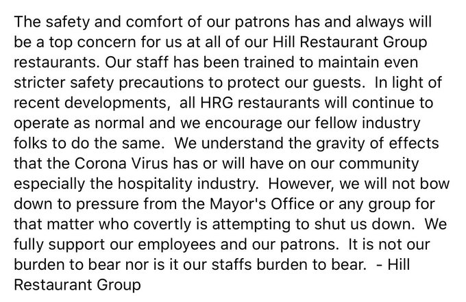 Restaurant group defying @MayorBowser #coronavirus order for restaurants to drastically reduce seating. Owner of Hill Restaurant Group which owns 7 Capitol Hill eateries tells @nbcwashington “let her shut us down”