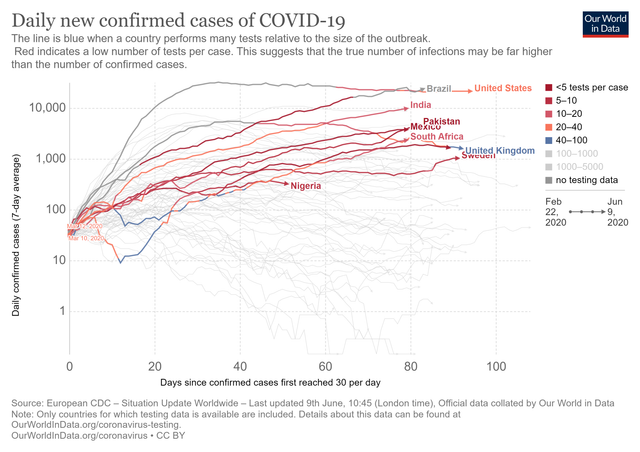Worldwide, the number of COVID-19 cases continues to climb unabated, now at 7.4 million, with almost 420,000 deaths. Daily new cases continue to exceed 100,000, while the daily fatality rates range between 3,000 and 5,000 cases.