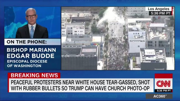 “I am the bishop of the Episcopal Diocese of Washington and was not given even a courtesy call, that they would be clearing [the area] with tear gas so they could use one of our churches as a prop,” the Right Rev. Mariann Edgar Budde told the Washington Post.