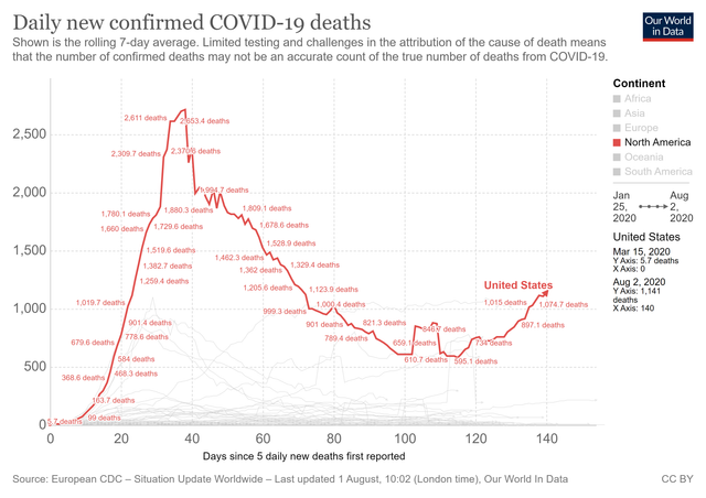 It has been 195 days since the first person with COVID-19 was identified in the US, in Washington state. Since then, the US has become the epicenter of the global pandemic, with over 4.8 million cases and over 158,000 deaths, outpacing every other nation without a seeming end to the daily gruesome figures. Two million cases were recorded just in July. The previous high in April had seen close to 900,000 cases.